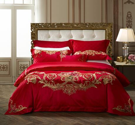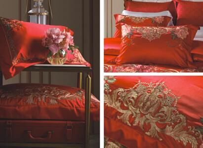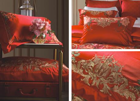 本款以纯正巴洛克风的美泉宫浮雕花纹和一系列富有美好寓意的花卉图案结合,以茜茜公主心形珠宝首饰为构图。运用多钟绣花手法和丰富绣花颜色搭配,设计出的一套具有心心相印、丰富多彩生活、一辈子幸福相守寓意的婚庆套件。